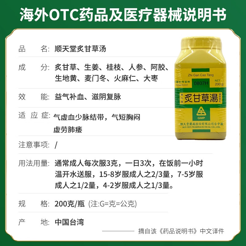 台湾顺天堂炙甘草汤益气补血滋阴复脉气虚血少脉结带气短胸闷虚劳 - 远丰医疗保健海外专营店