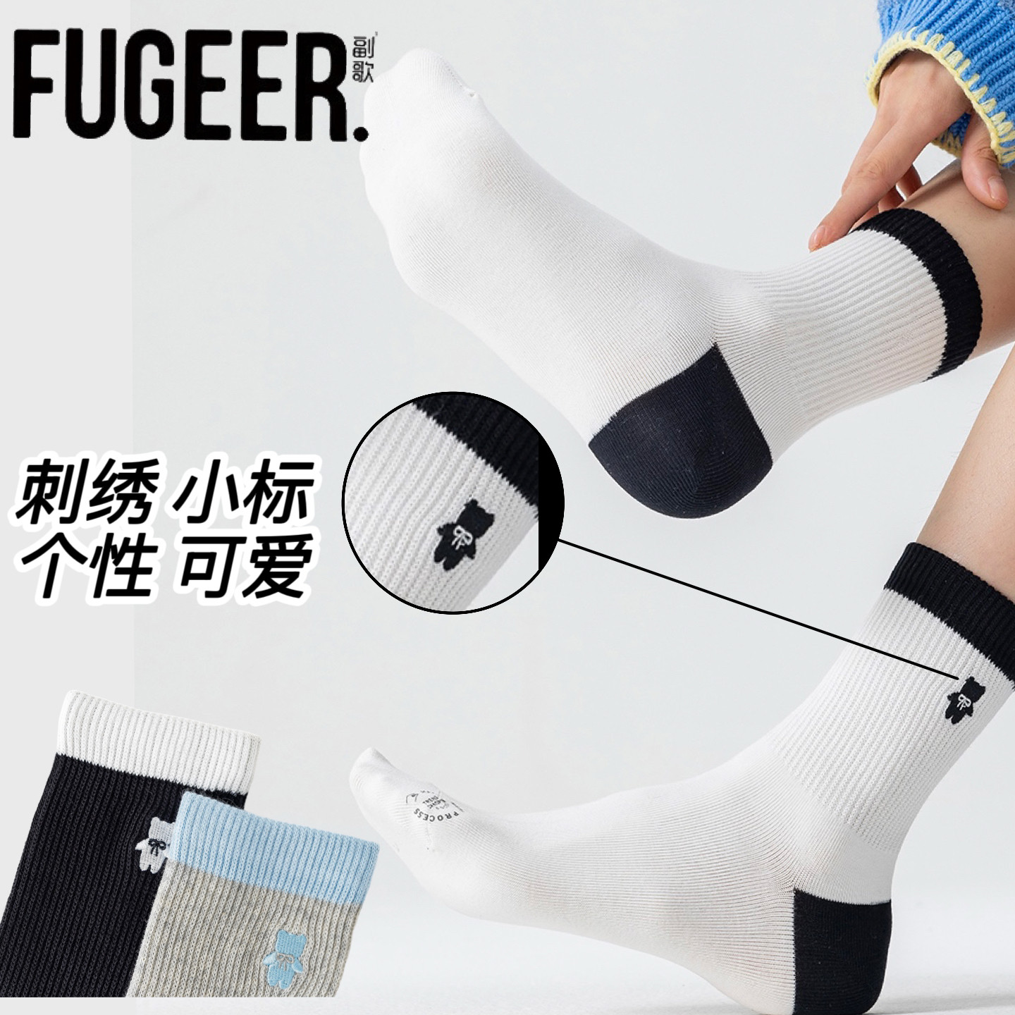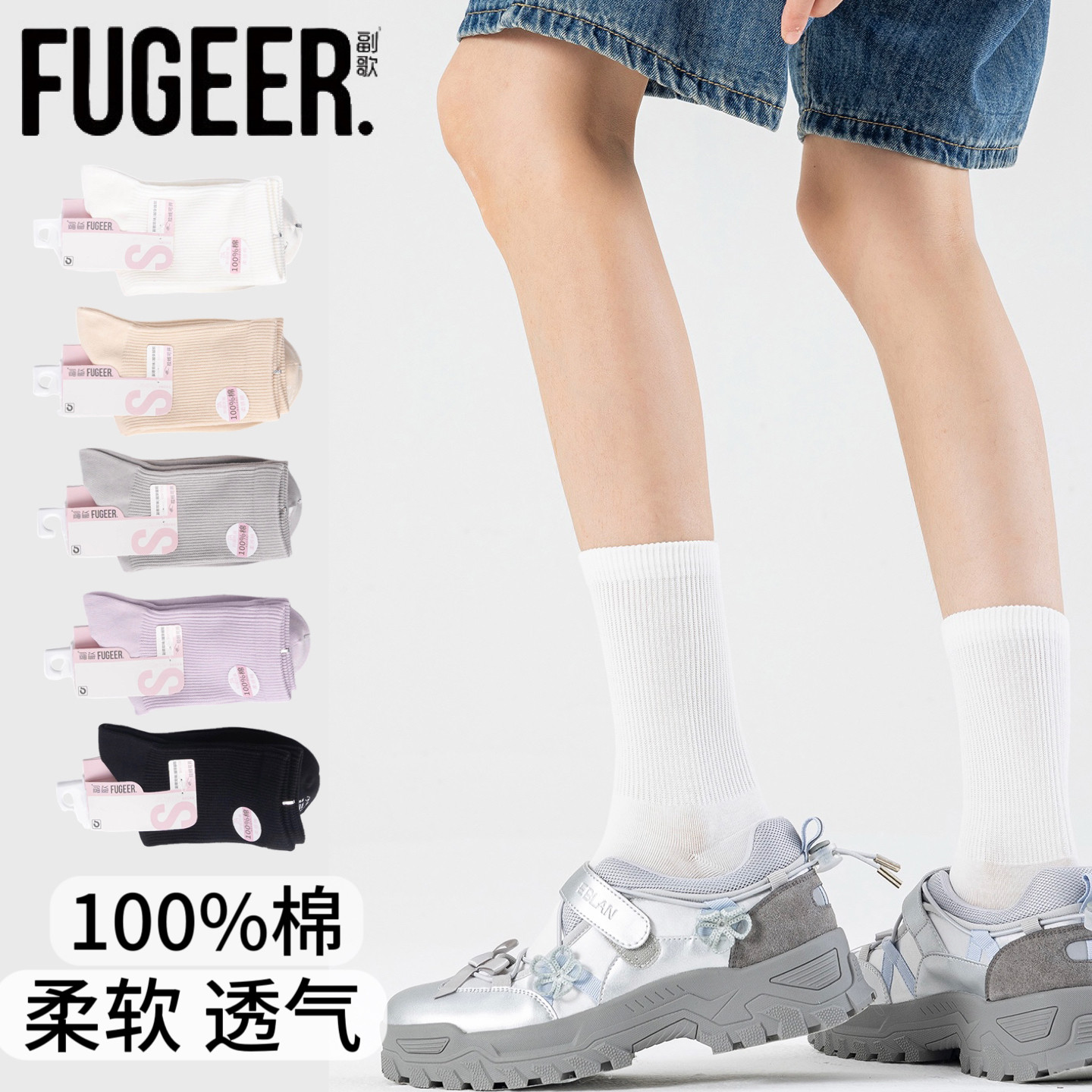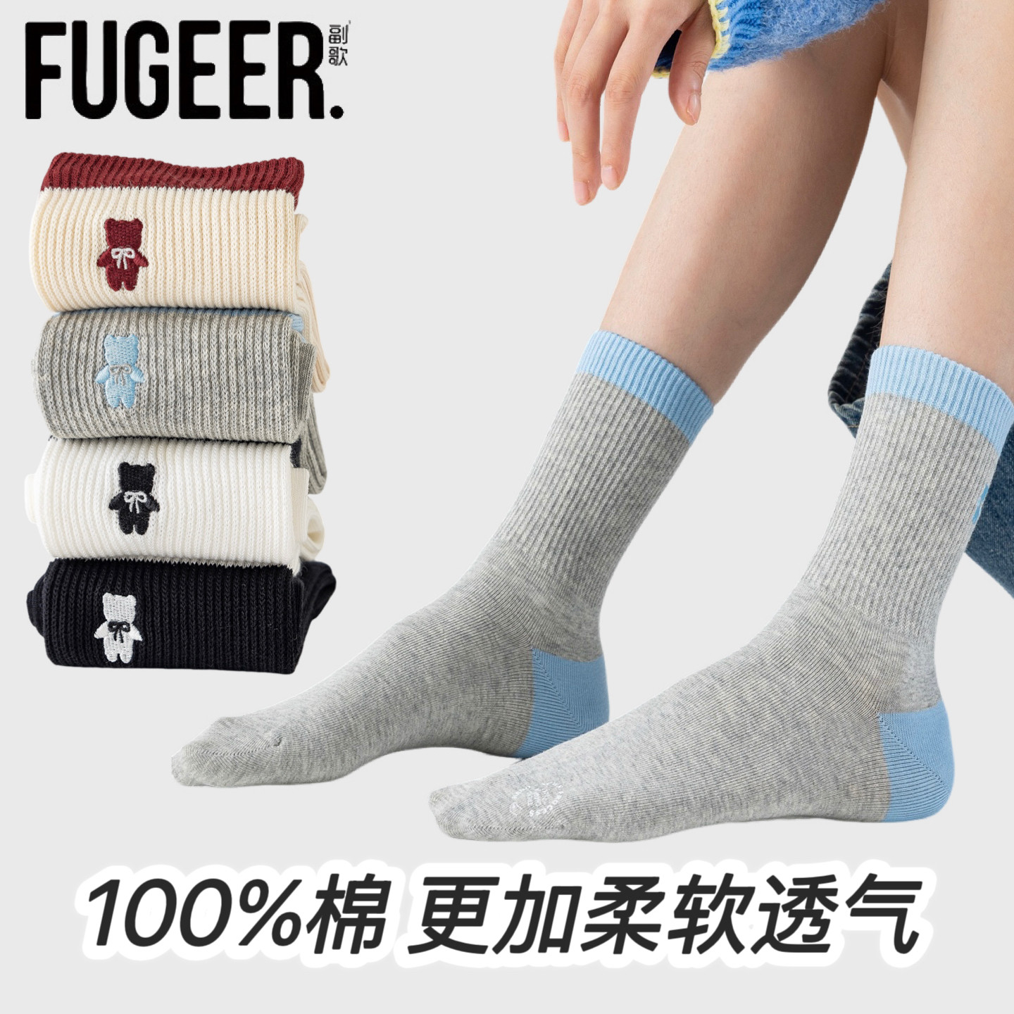副歌女士纯棉中筒袜抑菌防臭松口袜 透气全棉四季袜 秋冬女生休闲
