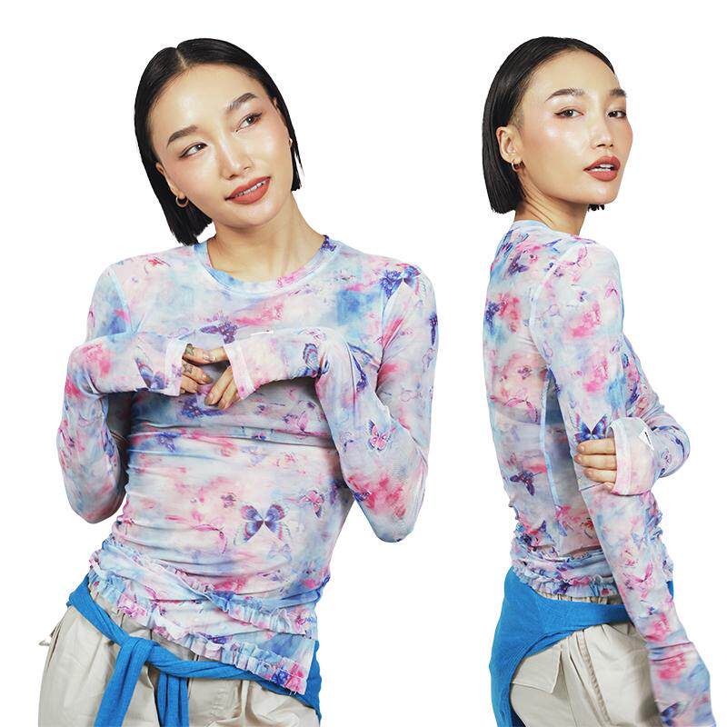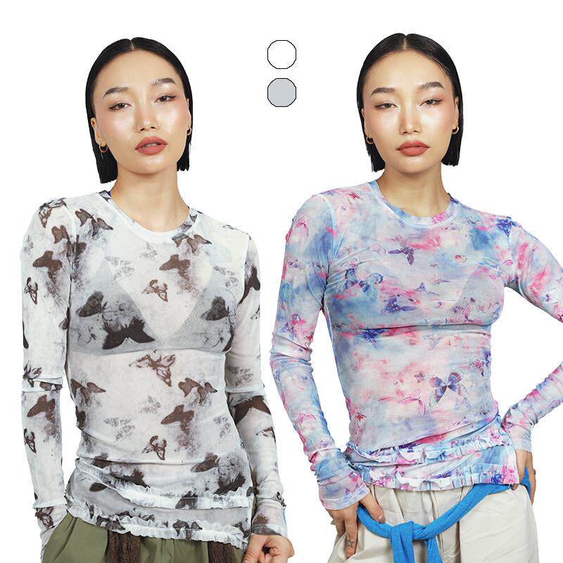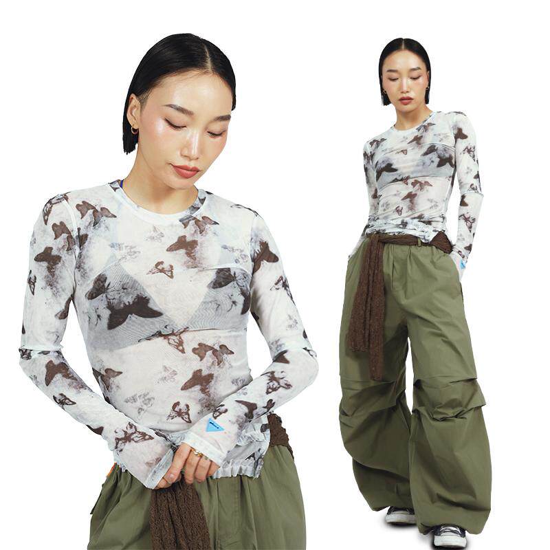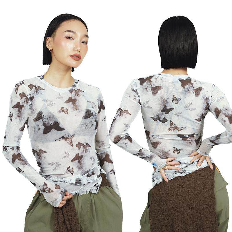 王润原创SOHANA2024 蝴蝶网纱辣妹内搭修身显瘦打底印花长袖T恤 - SOHANA