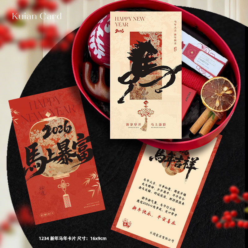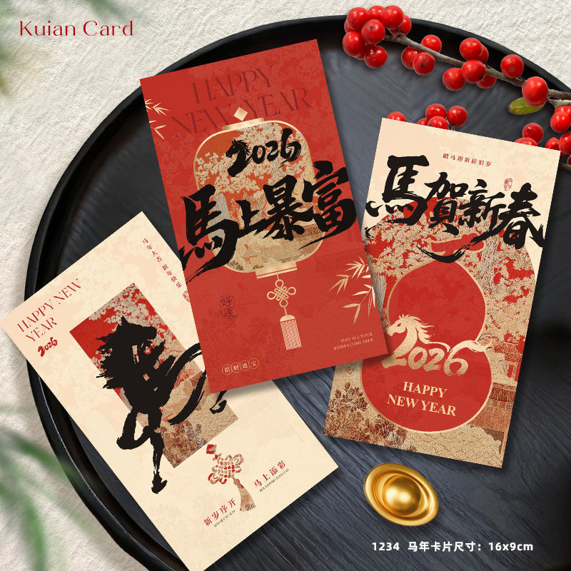 2026新年贺卡定制中国风马到成功祝福卡春节元旦明信片设计印刷 - Kuian card