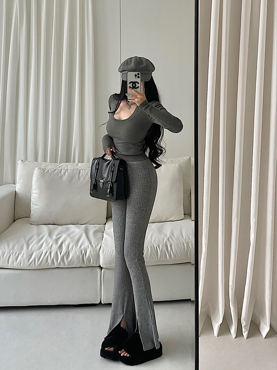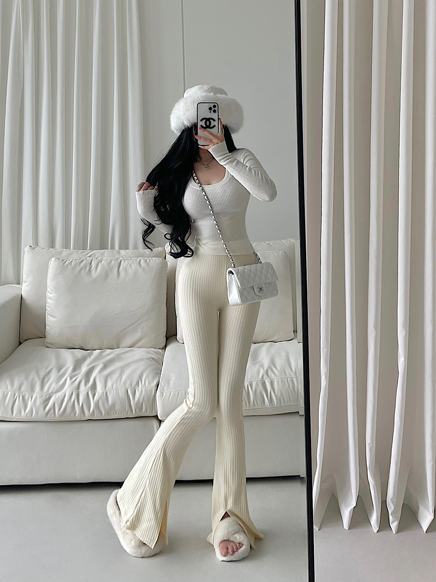 YoungGirlDay欧美高腰紧身显瘦微喇开叉显腿长针织休闲裤拖地长裤 - Young Girl Day