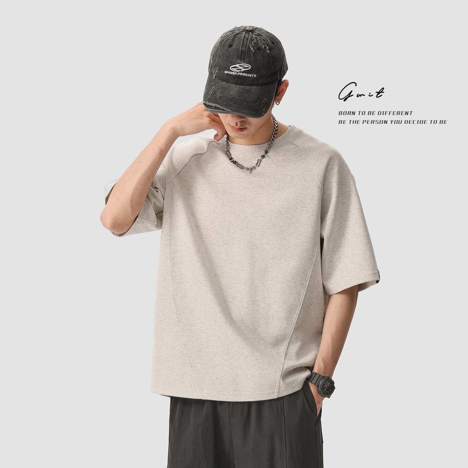 GWIT 重磅长绒棉半袖夏季潮牌廓形纯色短袖T恤男高级感分割解构 - GWIT九尾