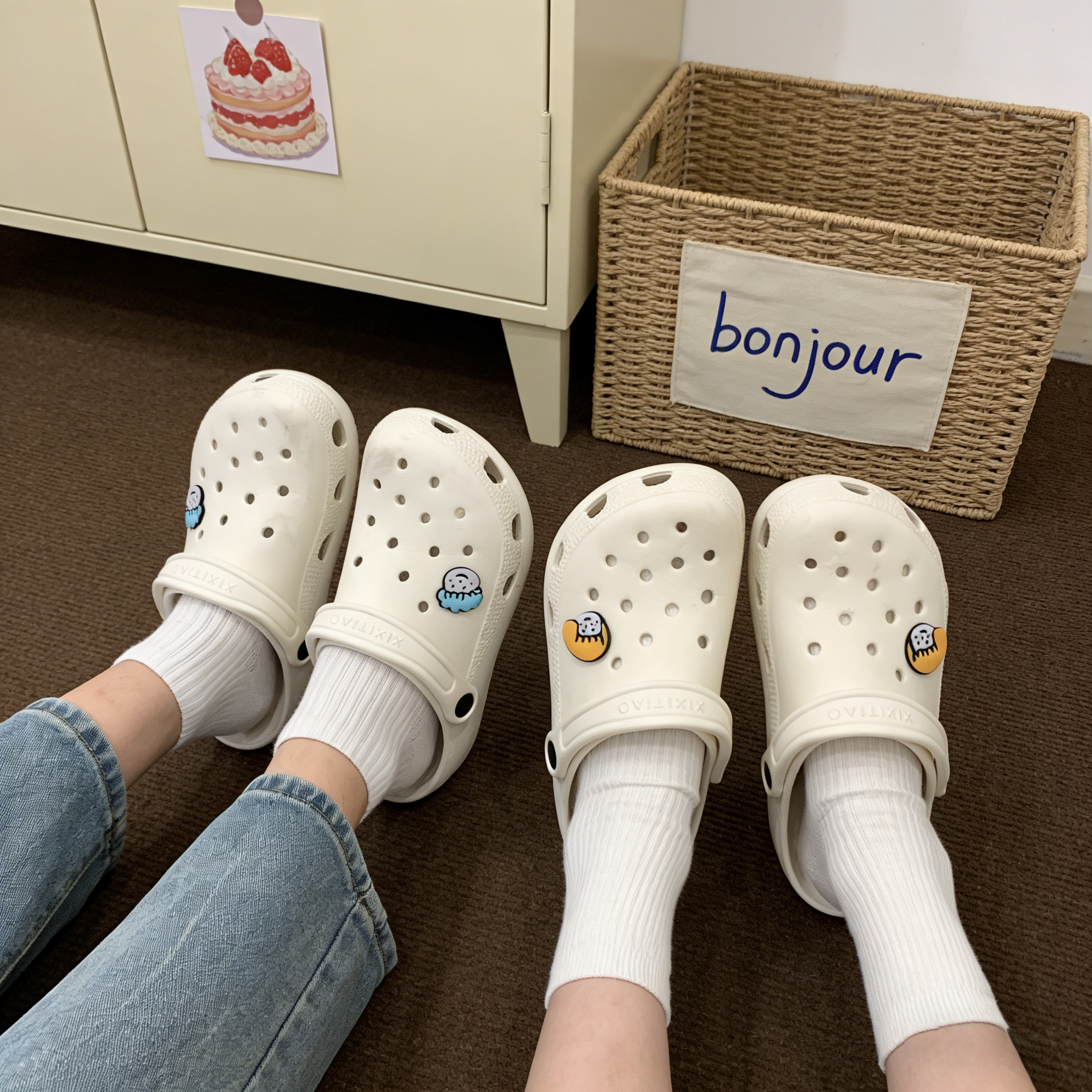 细细条 护士洞洞鞋女ins可爱卡通夏情侣防滑厚底足弓凉拖沙滩鞋男 - 细细条